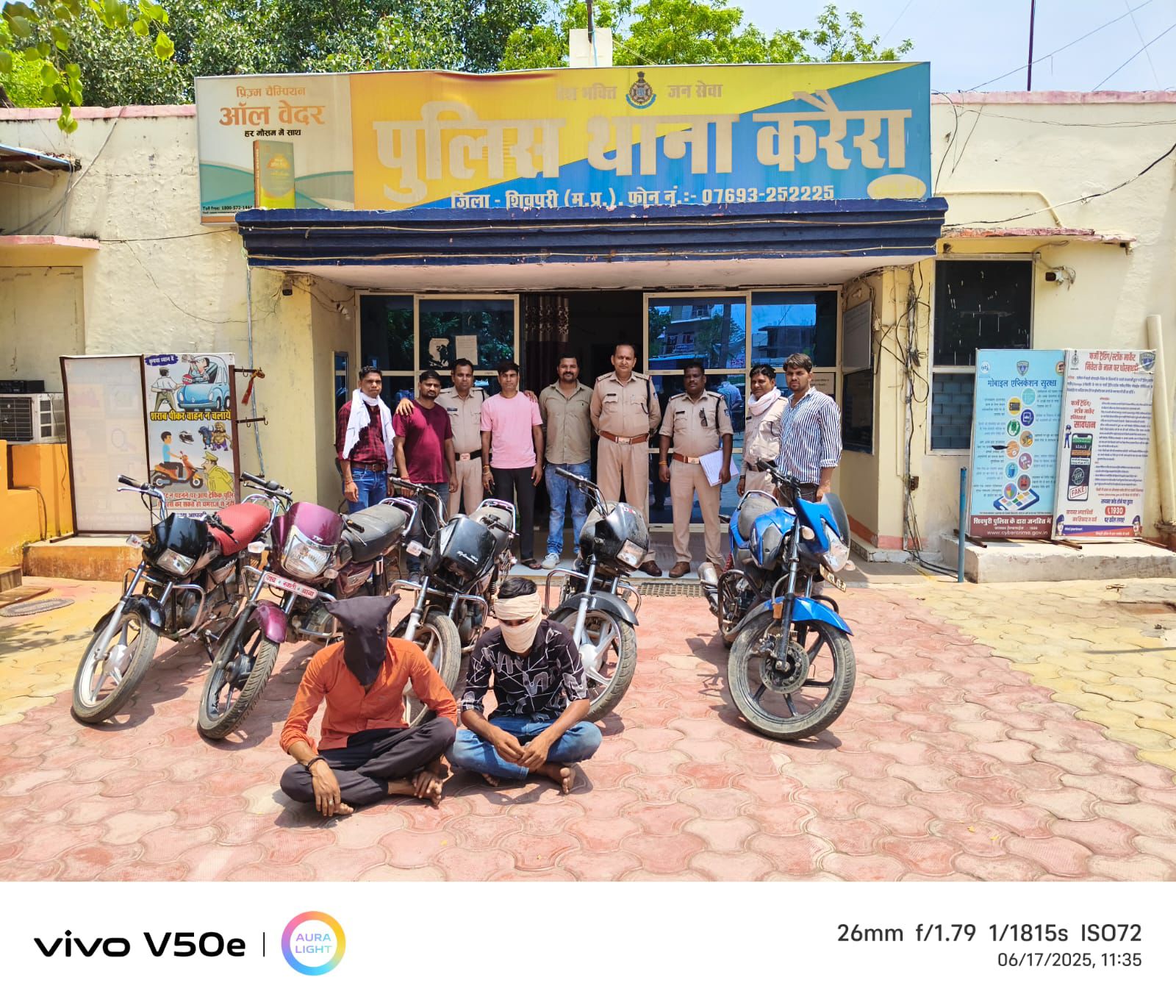 करैरा। पुलिस ने चोरी की मोटरसाइकिल सहित दो आरोपियों को गिरफ्तार किया है ,इनके कब्जे से 5 बाइक बरामद की है। पुलिस को मुखबिर द्वारा सूचना प्राप्त हुई कि धर्मबीर उर्फ धर्मा परिहार निवासी सिल्लारपुर का अपने साथी के साथ चोरी की मोटर सायकिल बेचने के लिये सोन चिरैया वोर्ड के पास ग्राम लंगूरी मे खडे हुये है । मुखबिर की सूचना की तस्दीक हेतु सोन चिरैया वोर्ड के पास ग्राम लंगूरी पहुचे तो मुखबिर के बताये हुलिया के दो लडके हीरो स्पलेण्डर काले रंग की बिना नम्बर की मोटर सायकिल पर बेठे दिखे जो पुलिस को देखकर भागने का प्रयास करने लगे । जिन्हे हमराही बल की मदद से पकडा जिनके नाम पता पूछने पर पहले ने अपना नाम धर्मबीर उर्फ धर्मा परिहार पुत्र रामेश्वर परिहार उम्र 23 साल निवासी सिल्लारपुर व पीछे बैठे लडके ने अपना नाम अमित पुत्र मंगल आहिरवार उम्र 24 साल निवासी वार्ड नं. 06 हरदौल मोहल्ला करैरा का होना बताया दोनो व्यक्तियों से मोटर साईकिल के संबंध में कागजात चाहे तो उन्होने कोई कागजात न होना बताया और पुलिस को गोल मोल जबाव देते रहे पुलिस को संदेह पक्का हो गया पुलिस ने दोनो से शख्ती से पूछताछ की तो भोपाल ,ग्वालियर से 05 मोटर सायकिलें चोरी करना बताया । उक्त आरोपीगण के कब्जे से 05 मोटर सायकिलों को विविधत जप्त कर आरोपीगणो को गिरफ्तार किया है ।