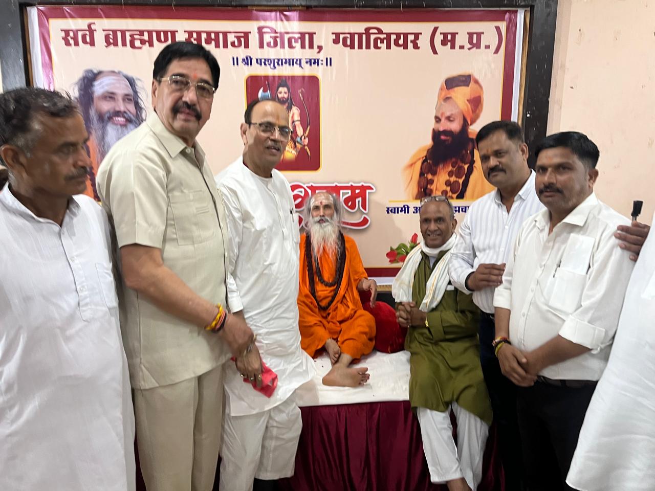 ग्वालियर। मानस भवन फूल बाग में सर्व ब्राह्मण समाज के निवेदन पर यज्ञ सम्राट श्री श्री 1008 स्वामी प्रखर जी महाराज एवं श्री 108 आनंद ब्रह्मचारी जी महाराज का आगमन हुआ सर्वप्रथम महाराज जी ने गोस्वामी तुलसीदास जी महाराज की प्रतिमा पर माल्यार्पण कर पूजा अर्चना की तत्पश्चात कार्यक्रम की शुरुआत हनुमान चालीसा से हुई स्वामी प्रखर जी महाराज यज्ञ सम्राट के नाम से जाने जाते हैं स्वामी जी ने विगत 40 वर्षों से अनन् का त्याग किया है स्वामी जी के विभिन्न शहरों में धर्मार्थ निशुल्क अस्पताल तथा एंबुलेंस सेवाएं जो की कुंभ के समय काम कर रही थी परम आदरणीय स्वामी जी के द्वारा सर्व ब्राह्मण समाज को अपना उपदेश देते हुए कहा कि प्रत्येक ब्राह्मण को वेद माता गायत्री मंत्र का जाप करना चाहिए गायत्री मंत्र से ब्राह्मण का तेज और आशीर्वाद फलीभूत होता है ब्राह्मण को सदैव शुद्ध आचरण करना चाहिए महाराज जी द्वारा देश में व्याप्त आतंकवाद तथा देशद्रोही गतिविधियों पर हिंदुओं में अलख जगाने की बात कही महाराज जी के द्वारा 2026 में गायत्री यज्ञ पुष्कर में कराए जाने का संकल्प है इस हेतु सभी ब्राह्मणों में वेद माता गायत्री की पूजा पाठ पर जोर दिया कार्यक्रम का संचालन पंडित महेश मुदगल जी द्वारा किया गया कार्यक्रम के मुख्य संयोजक पंडित परमानंद शर्मा जी पूर्व निरीक्षक मध्य प्रदेश पुलिस तथा कार्यक्रम में पधारे अतिथियों में सर्वश्री पंडित रामबाबू कटारे जी पंडित अशोक गौतम जी भार्गव समाज जिला ग्वालियर के अध्यक्ष पंडित केशव पांडे जी वरिष्ठ समाज सेवी एवं वरिष्ठ पत्रकार पंडित अशोक पटसरिया जी पंडित श्याम बाबू शर्मा जी पूर्व अध्यक्ष भार्गव समाज पंडित विजय कविजू पंडित महंत शिवकुमार शर्मा जी महलगांव पंडित लखन लाल भार्गव जी पंडित वसंत पाराशर जी पंडित अरुण शर्मा जी पूर्व अध्यक्ष पंडित राजेश मिश्रा जी संभागीय अध्यक्ष सर्व ब्राह्मण महासभा पंडित सोनू चौधरी जी युवा जिला अध्यक्ष भार्गव ब्राह्मण समाज ग्वालियर पंडित प्रकाश नारायण शर्मा जी पंडित भगवती प्रसाद पचौरी जी पंडित सत्य प्रकाश शर्मा जी महलगांव पंडित संगम भार्गव जी पूर्व युवा जिला अध्यक्ष पंडित एमडी शर्मा जी पंडित सत्य प्रकाश शर्मा जी पंडित जय नारायण शर्मा जी पंडित के पी अर्जरिया जी अध्यक्ष जिझोतिया ब्राह्मण समाज पंडित राजीव शर्मा जी उपाध्यक्ष जिझोतिया ब्राह्मण समाज जिला ग्वालियर श्रीमती वंदना भूपेंद्र प्रेमी जी प्रदेश अध्यक्ष सर्व ब्राह्मण महासभा महिला. श्रीमती अनिता भार्गव पूर्व महिला जिला अध्यक्ष श्रीमती रानू दुबे महिला अध्यक्ष भार्गव ब्राह्मण समाज ग्वालियर पंडित जगदीश शर्मा जी एडवोकेट पंडित स्वामी जी डबरा पंडित अभिलाष भार्गव बिलौआ पंडित यतेंद्र शर