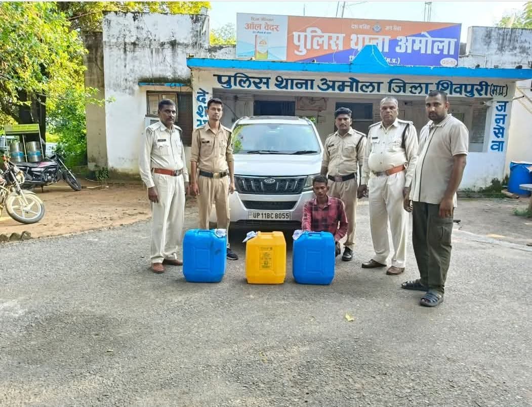 थाना प्रभारी अमोला उप निरीक्षक अंशुल गुप्ता को मुखविर द्वारा सूचना प्राप्त हुई। मुखविर सूचना पर से आरोपी टिन्कू कुशवाह पुत्र राजाराम कुशवाह उम्र 20 साल निवासी करार खेड़ा चौकी हिम्मतपुर थाना पिछोर जिला शिवपुरी के कब्जे से 110 लीटर हाथ भट्टी की कच्ची शराब कीमती 11000 रुपये एवं XUV कार