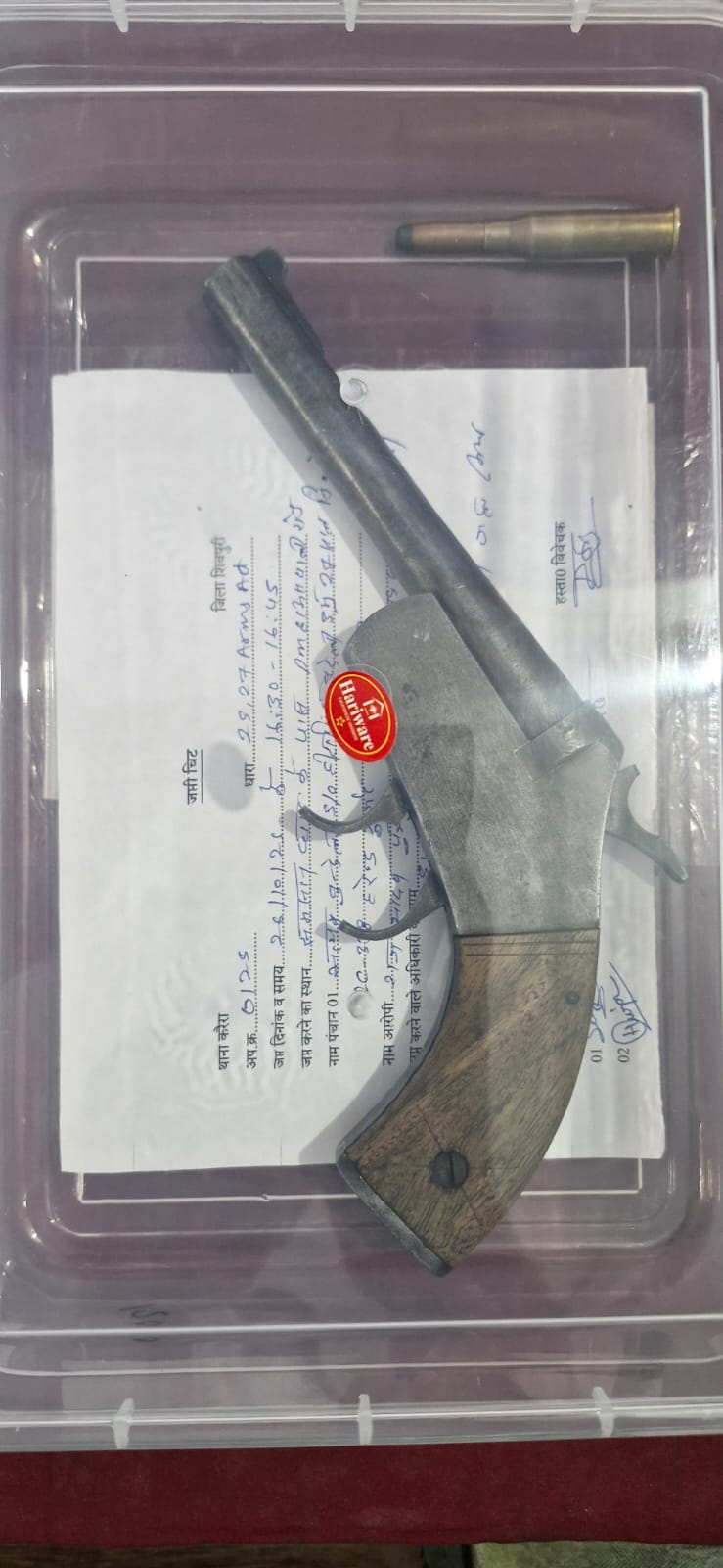 अपना नाम राज यादव पुत्र चन्द्रभान सिह यादव उम्र 19 साल निवासी ग्राम वहेरा थाना दिनारा हाल निवास मंडी के पास करैरा थाना करैरा जिला शिवपुरी का होना बताया जिसकी जामा तलाशी लेने पर कमर मे दाहिनी तऱफ एक 315 बोर का कट्टा खुरसे मिला तथा एक जिन्दा कारतूस मिला, कट्टा एवं कारतूस रखने का बैध लायसेंस चाहा तो नही होना बताया यह कृत्य अपराध धारा 25/27 आर्म्स एक्ट के तहत दण्डनीय पाया जाने से कट्टा एवं कारतूस को जप्त किया गया।